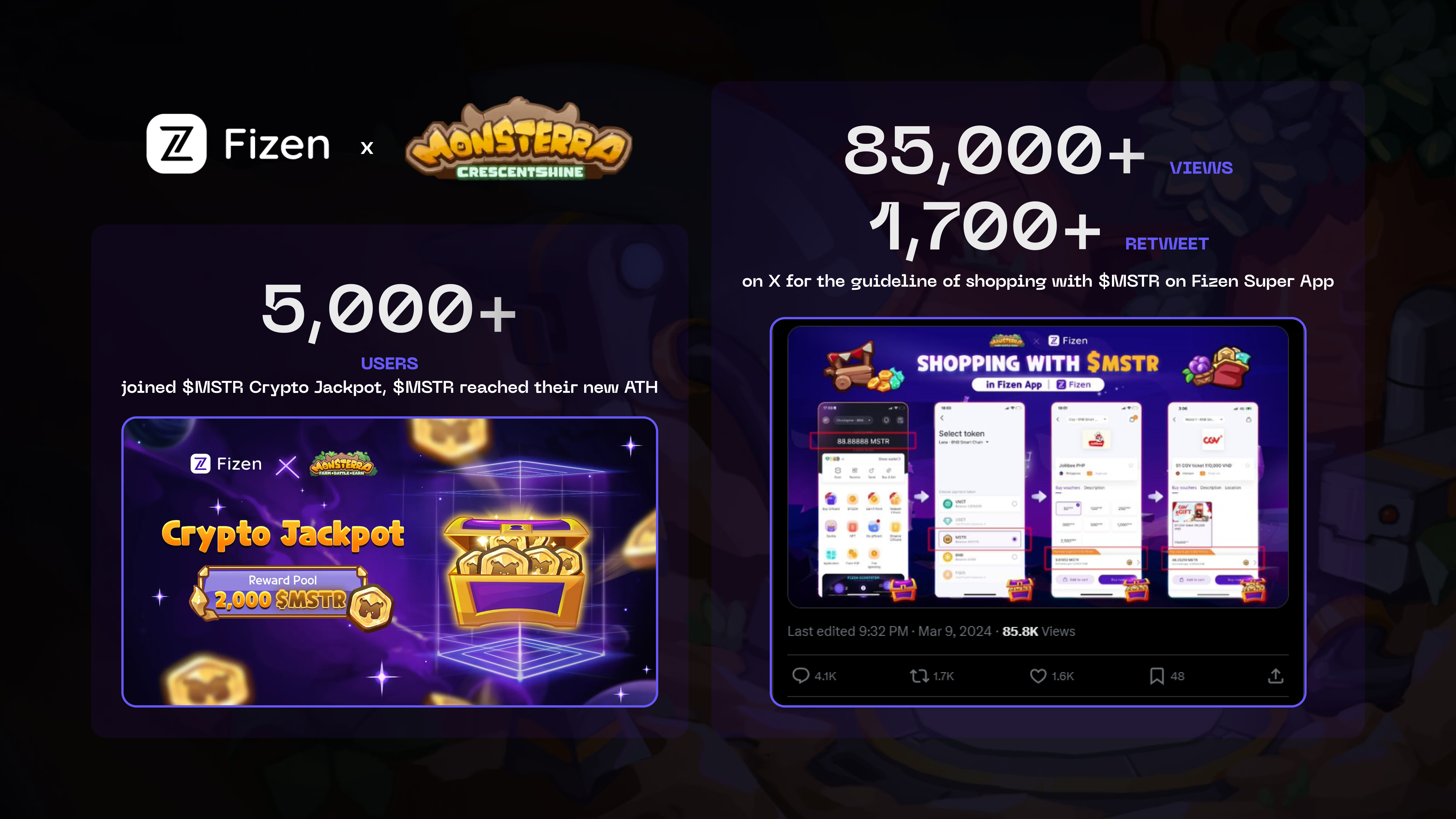 Following the integration of Monsterra's token $MSTR with our platform, we initiated a series of co-marketing campaigns with the key metrics of brand awareness and performance awareness. The in-app Monsterra Crypto Jackpot event was a standout, drawing in 5,000 participants and signaling a strong engagement from the community, which coincided with the token reaching a new all-time high (ATH). This engagement was mirrored on social media, where our guideline post for shopping with $MSTR on the Fizen Super App attracted 90,000 views and 1,800 retweets, as evidenced by the Twitter post