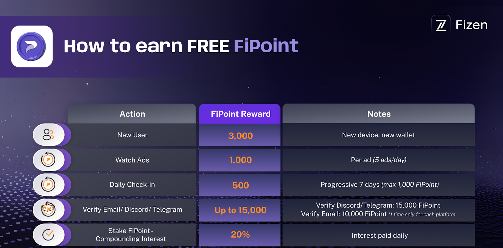 FiPoint is Fizen.io’s loyalty reward points (not a cryptocurrency) that is free to earn through in-app activities and cannot be bought.