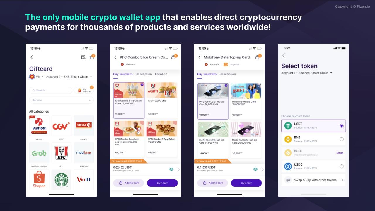 The Fizen Super App has made it easy for travelers, shoppers, and digital nomads to make crypto payments. You can use crypto to pay for online purchases, utility bills, phone top-ups, gift cards, eSims, hotels, and airlines.