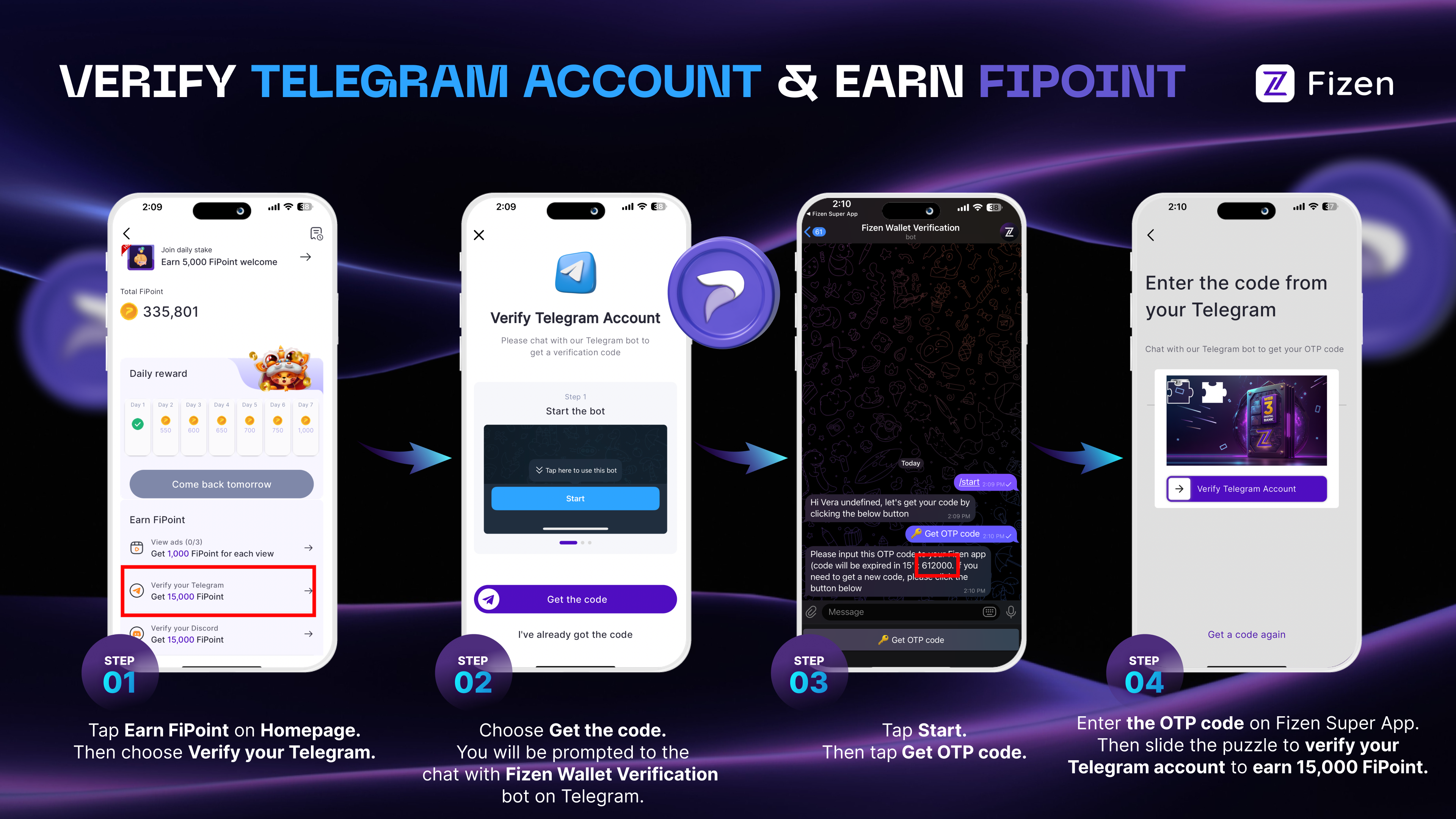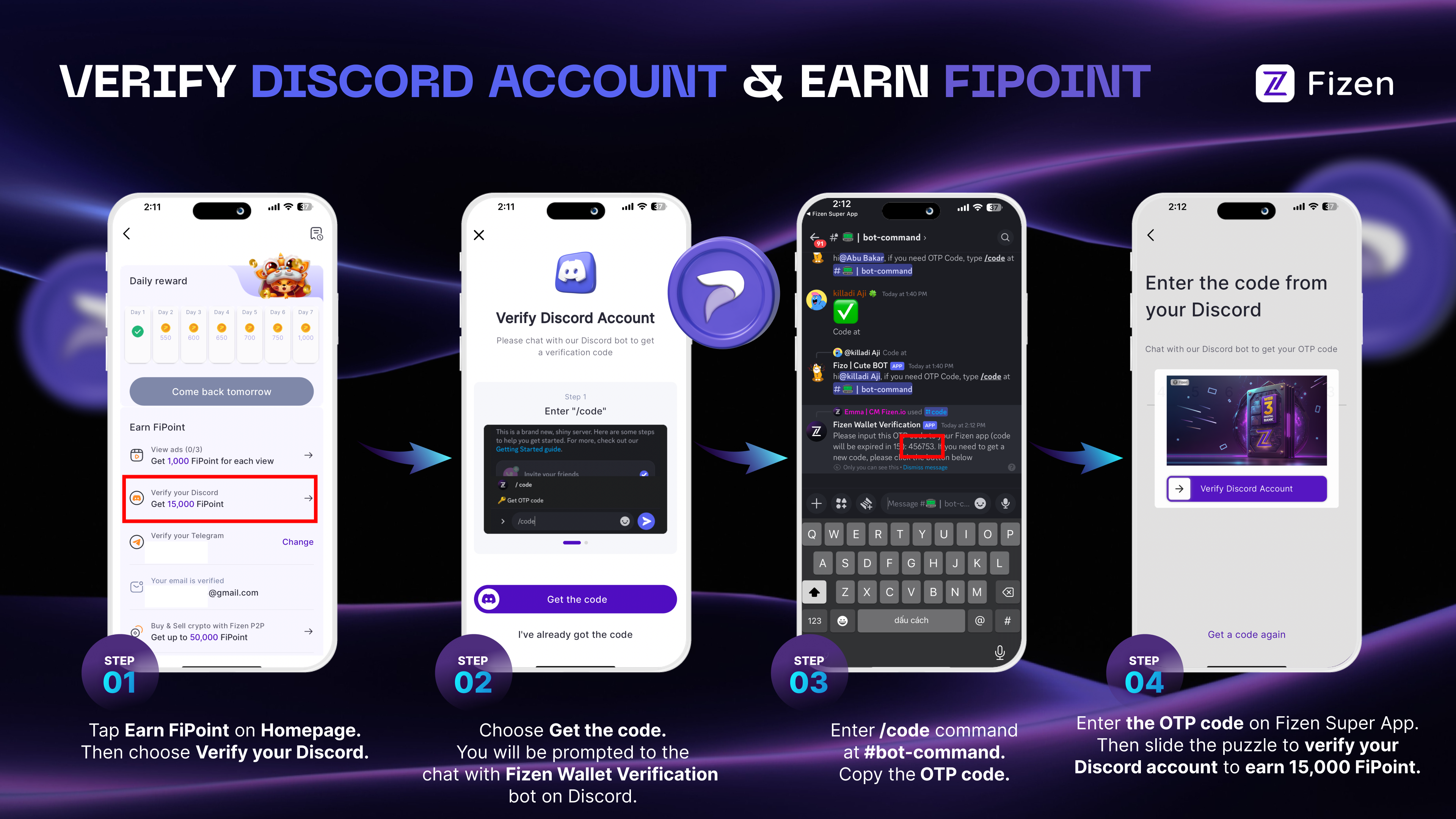 I'm sure you all have your own Telegram and Discord accounts, right? If so, you are in luck! Now you can earn a whopping 30,000 FiPoint in total just by verifying your Telegram and Discord accounts on the Fizen Super App.✨
