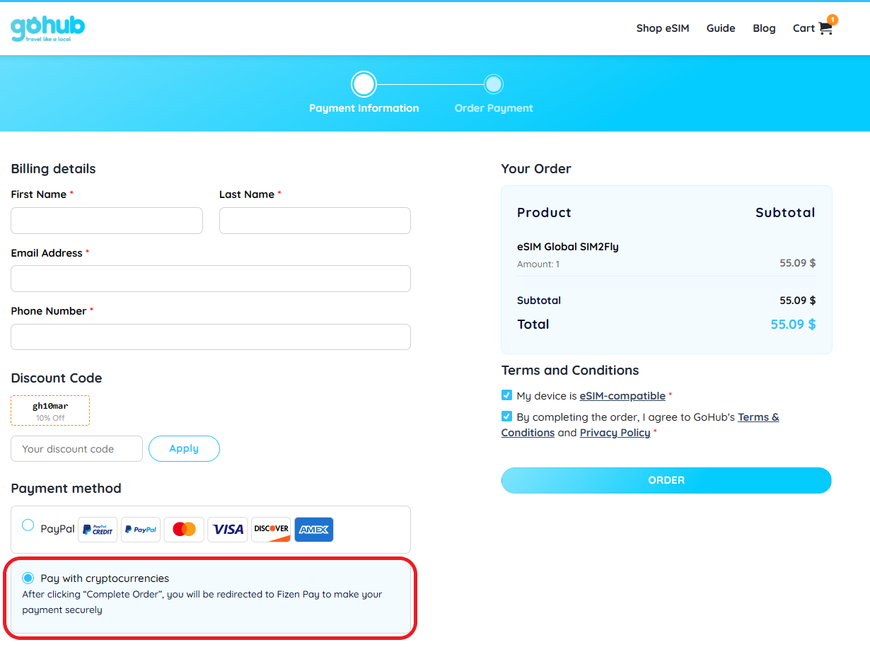 We have great news for crypto travelers! Now you can buy eSim on Gohub for 131 countries worldwide with cryptocurrencies via Fizen Pay. Gohub is a fresh travel solution start-up serving 100,000+ customers with the best deal on eSim.