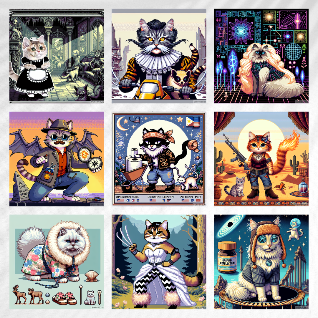 All of the cat NFTs are AI-generated and evolvable from Gen1 NFTs to Gen9 NFTs. These NFTs have randomized traits, and all trait data are inscribed on the aelf blockchain. Also, these NFTs are re-rollable back to $SGR tokens for users to trade them as fungible tokens.