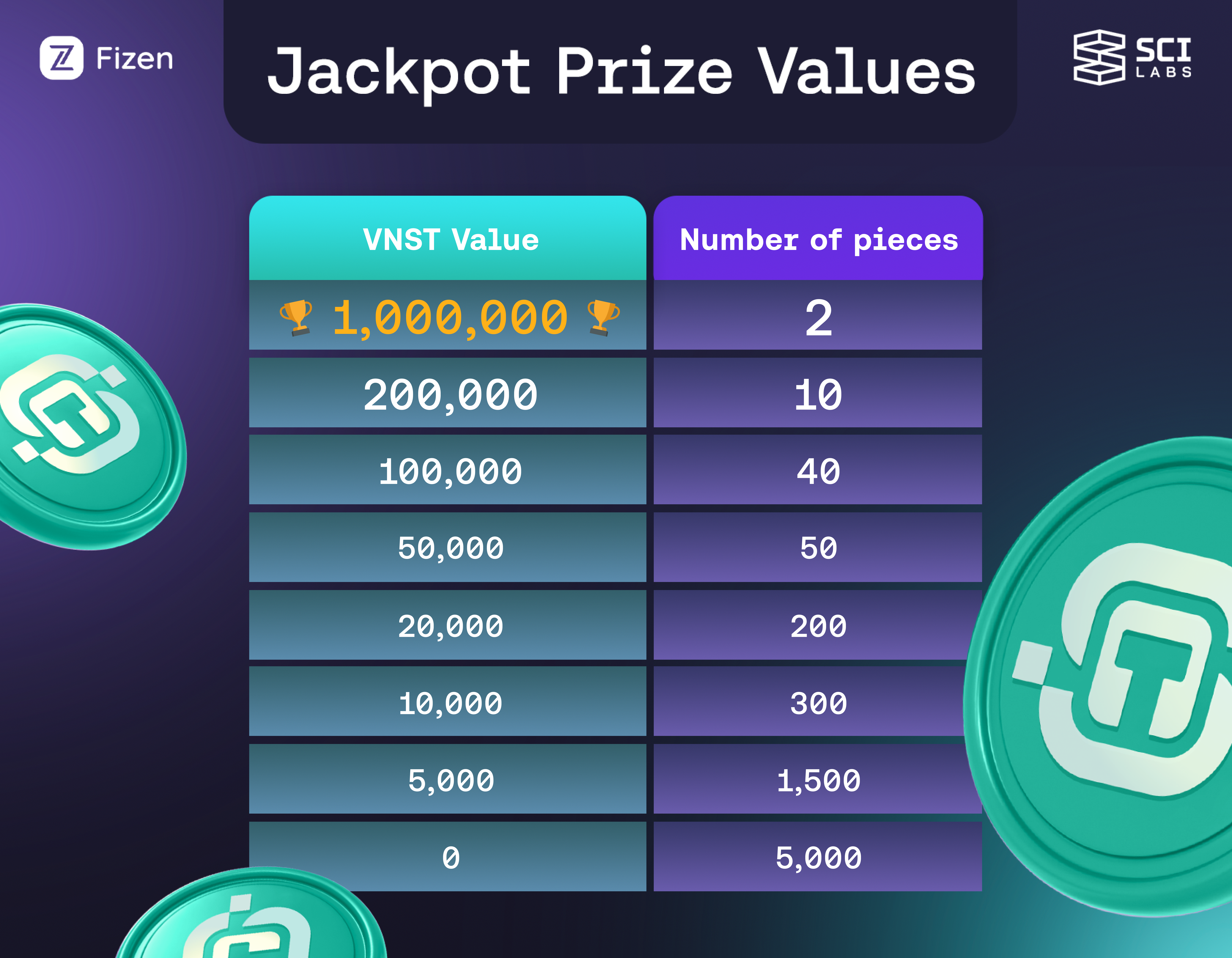 The total prize pool is 25,000,000 VNST and there are 2 chances of winning the biggest jackpots of 1,000,000 $VNST.