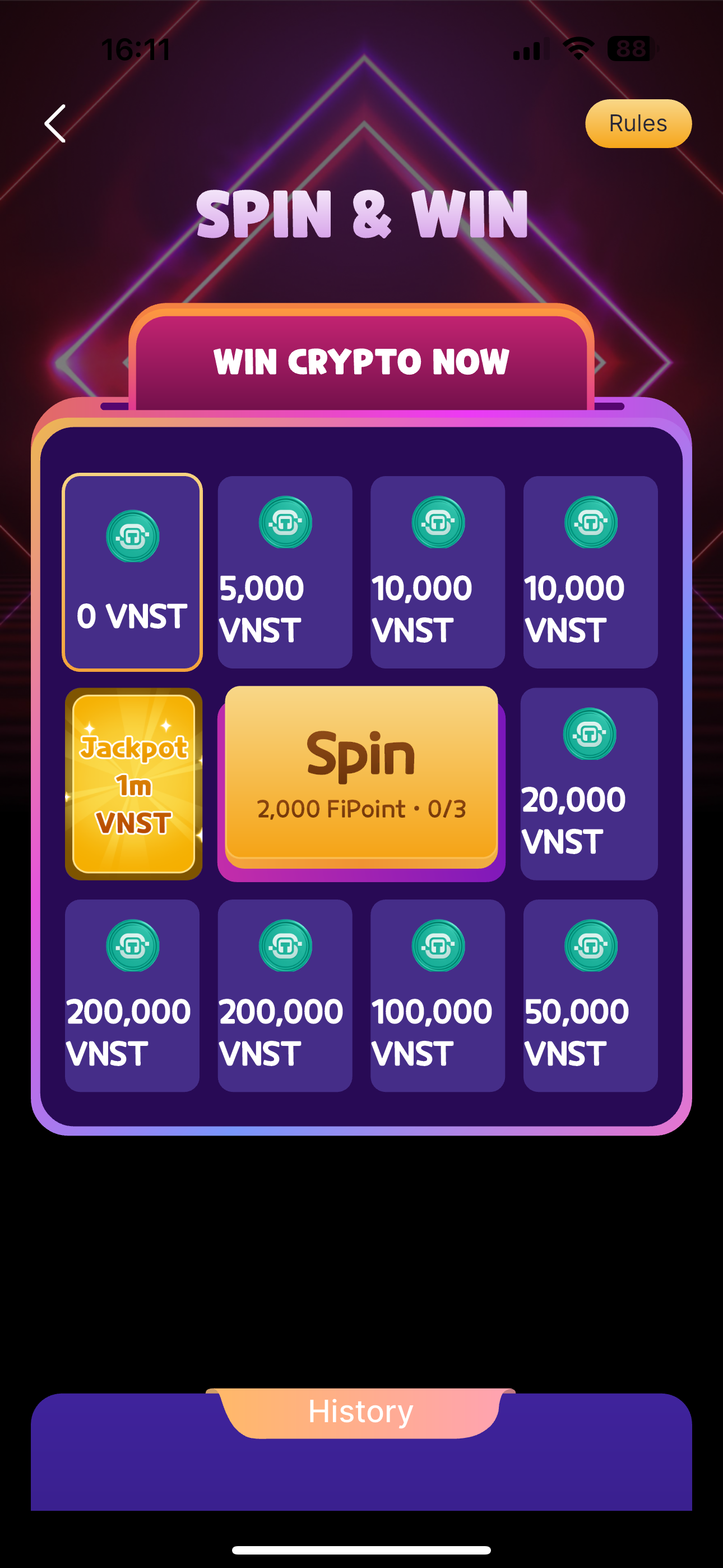 Head to "Redeem FiPoint" now and take a spin on the $VNST Crypto Jackpot.